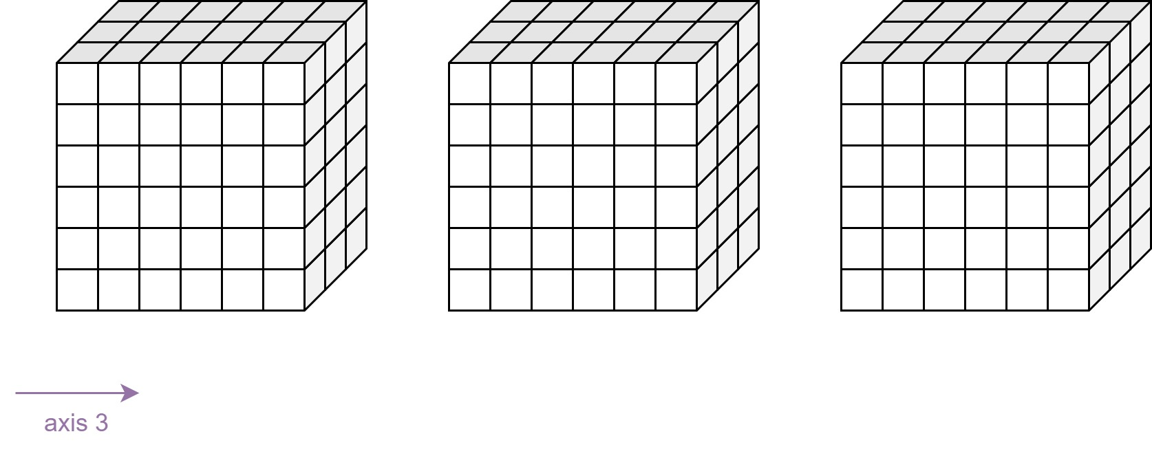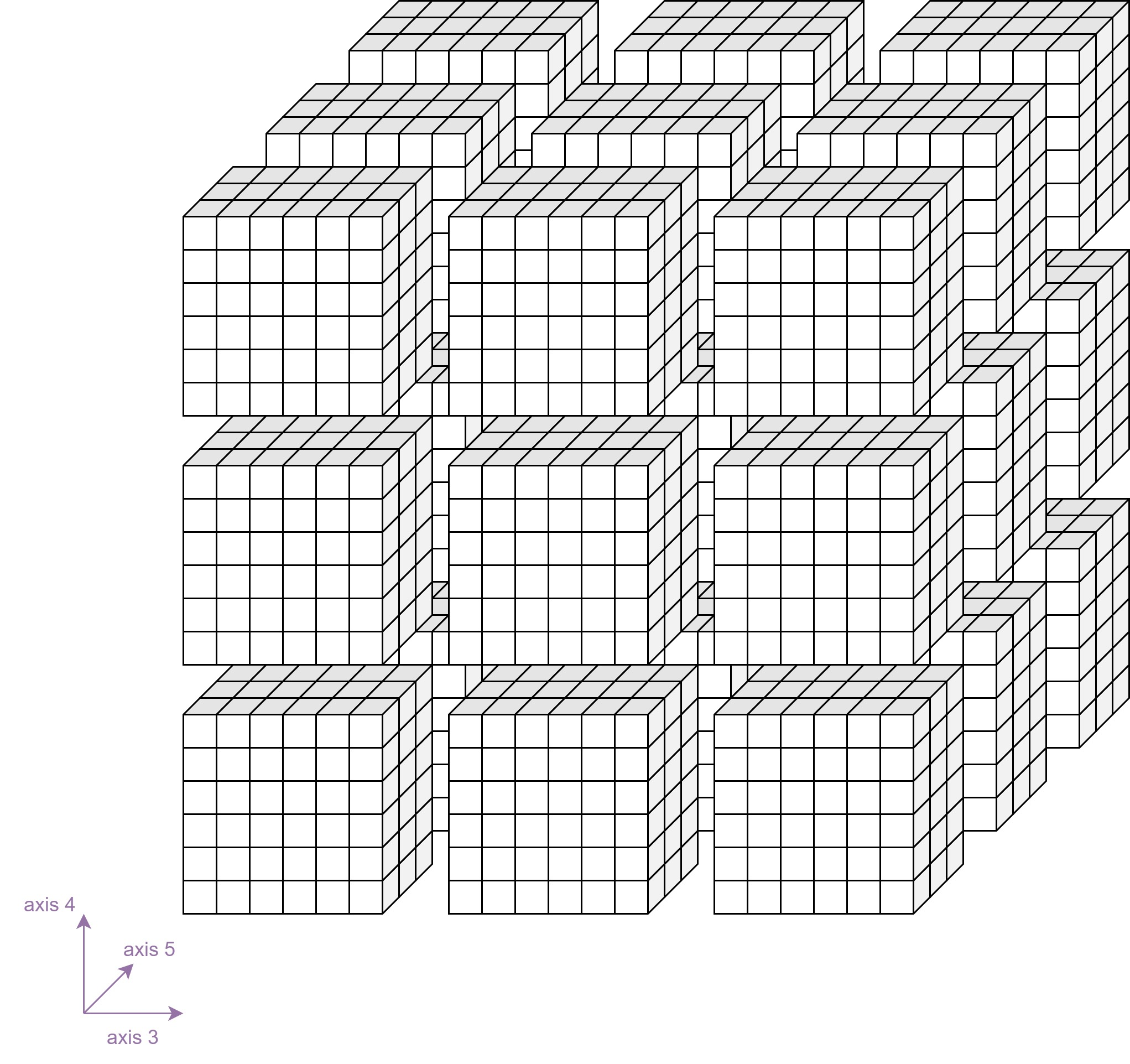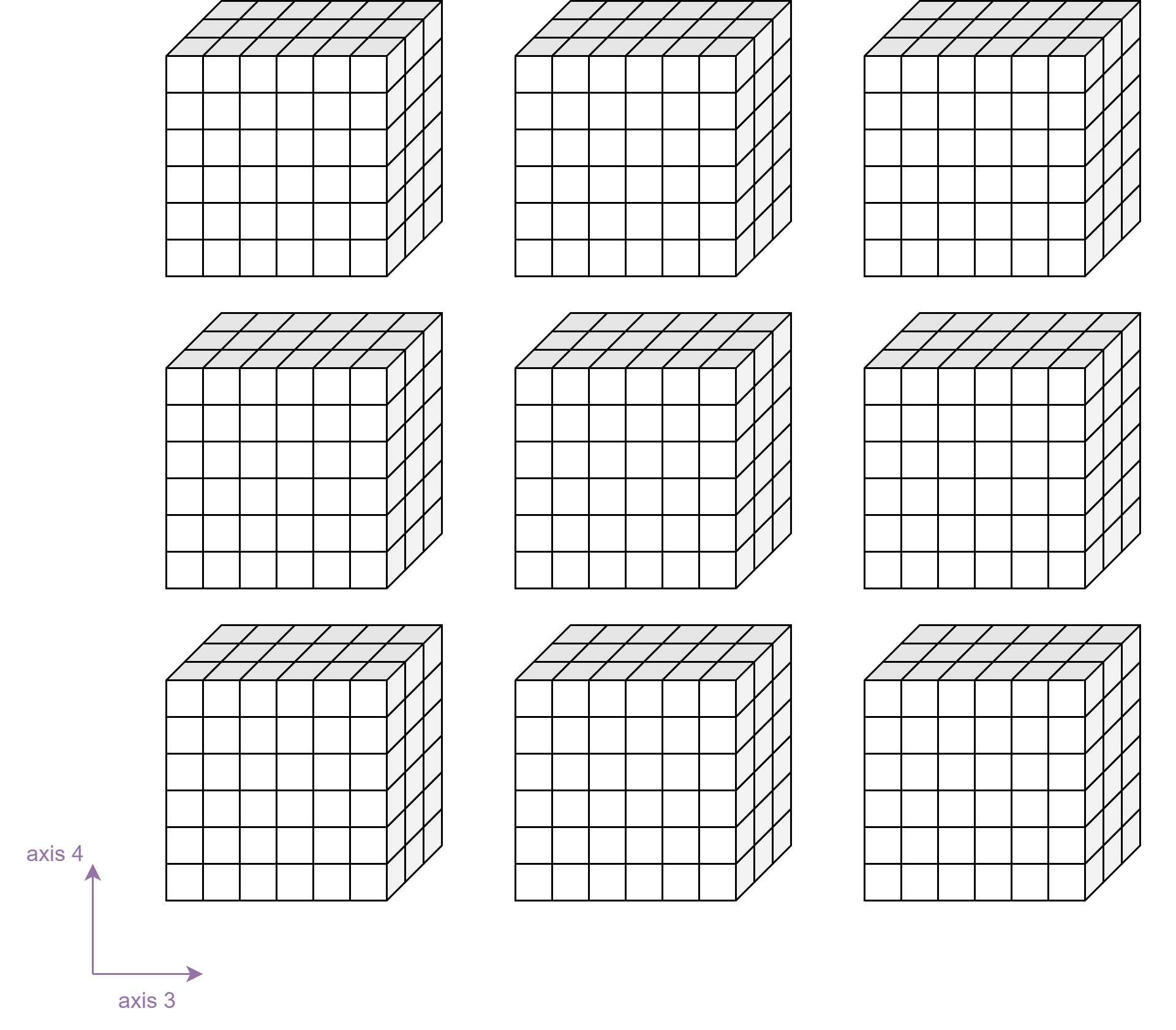 Sometimes even more than five dimensions are needed for representing our data. An example of 6D input data would be if we would split our videos into multiple short videos. We need one more exis to represent the number of video snippets of our input data. We can visualize 6D tensors as a cube of cubes like it is shown in the following diagram. Axis 3 would represent a single video snippet. A complete video would be represented by axis 3 and axis 4, where each row is a video snippet and the 2D grid represents the complete video. A batch of videos would be represented by stacking multiple 2D grids. The result would be a 3D grid where each cell contains a 3D tensor.