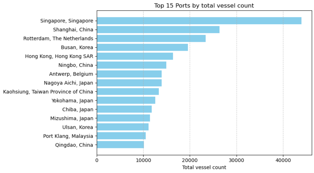 * [ ] Plot the top 15 significant ports, by using the total amount of vessels handled by the port. The resulting diagram should look something like this:
